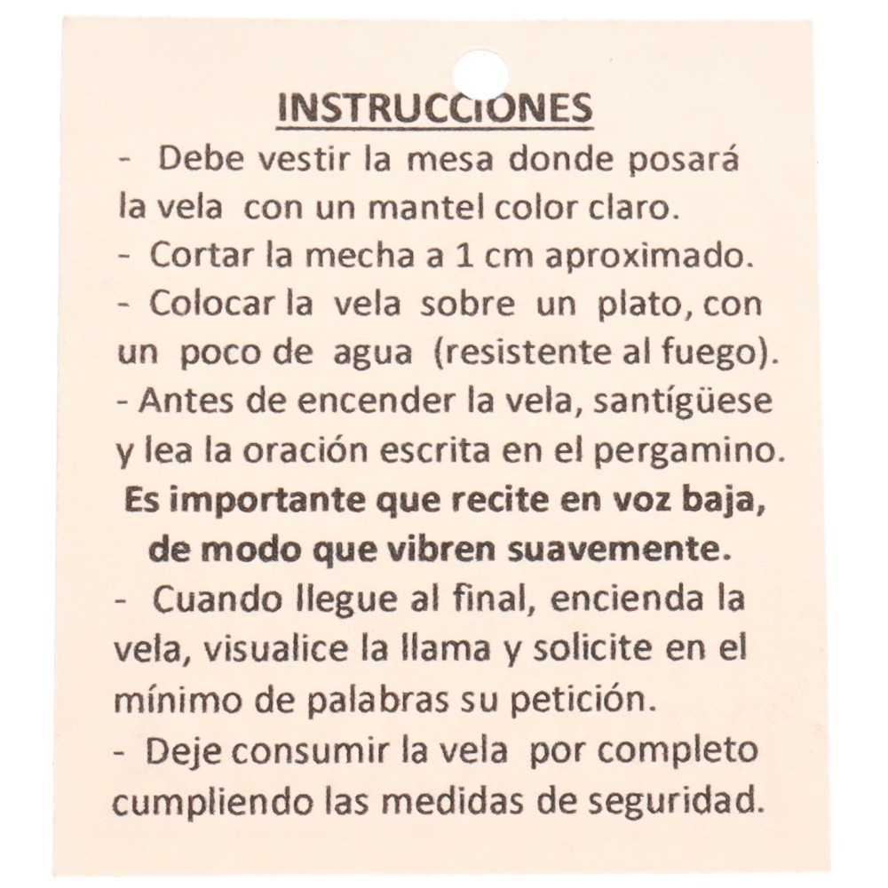 Fabriqués avec la combinaison parfaite d'herbe et de couleur pour que l'énergie de sa lumière rayonne et libère dans l'être et son environnement l'élément nécessaire ou le but que l'on souhaite atteindre. Ils sont également accompagnés d'un manuel d'instructions pratiques et simples ainsi que de la prière à réciter au moment de l'allumage de la flamme.