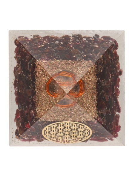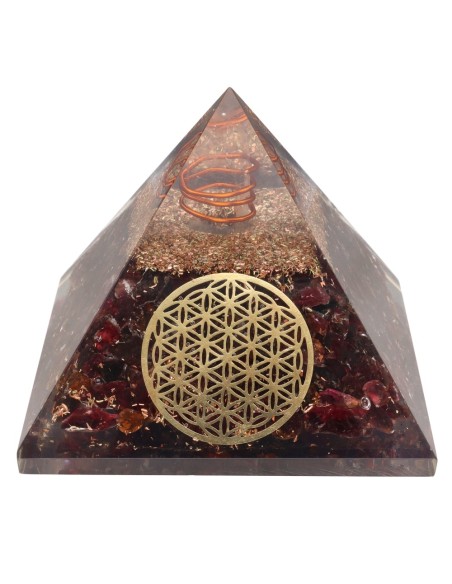 Pyramide en résine grenat orgonite avec fleur de vie 7x7cm