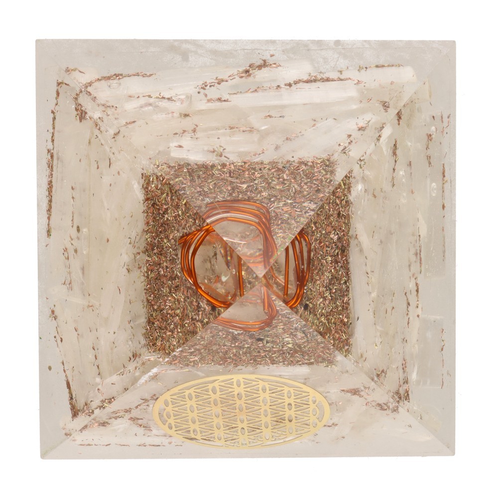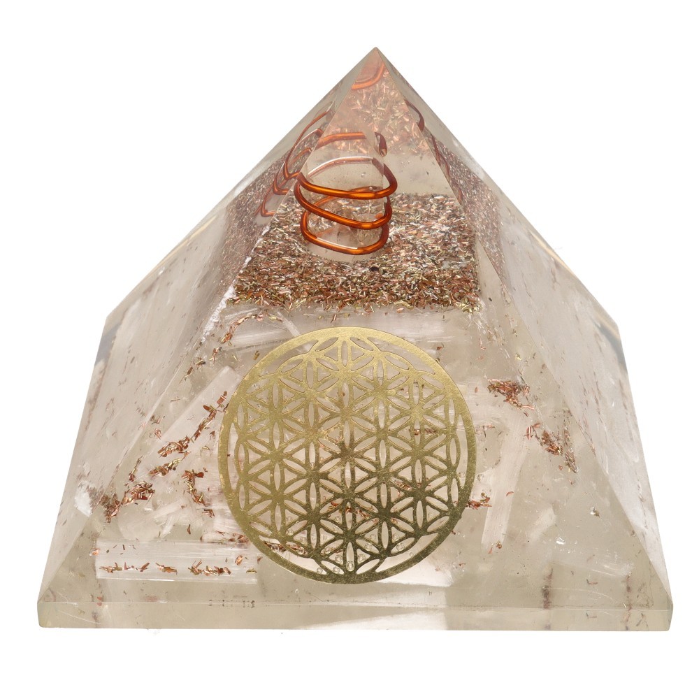 Sélénite Orgonite Pyramide en résine avec fleur de vie 7x7cm