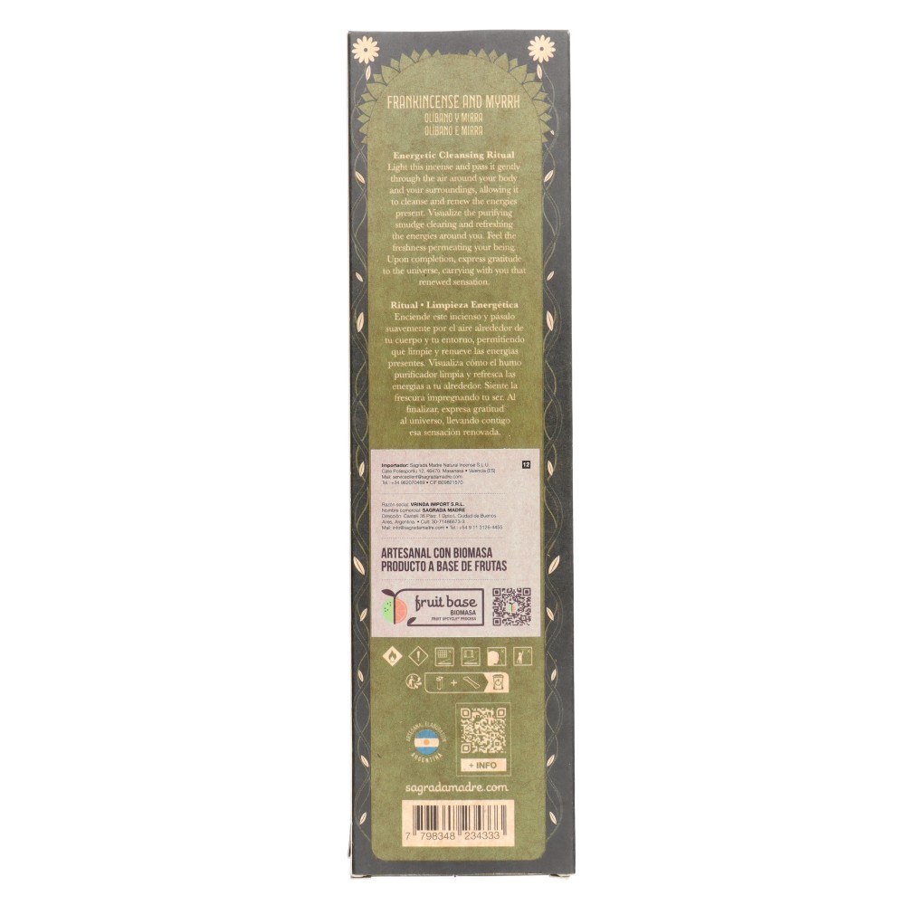 Modo de uso: Encender la punta del Sahumerio y apagar la llama, dejando que se produzca una pequeña brasa