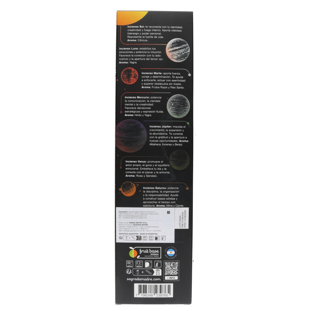 7 inciensos cosmos, cada uno vinculado a un planeta y su poder único. Con aromas especiales, equilibran y potencian tus energías, ayudándote a conectar con los ritmos cósmicos. Un ritual para armonizar cuerpo, mente y alma.