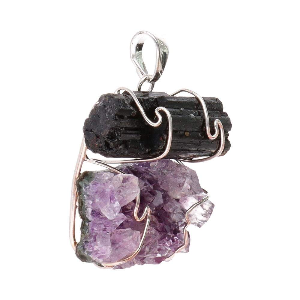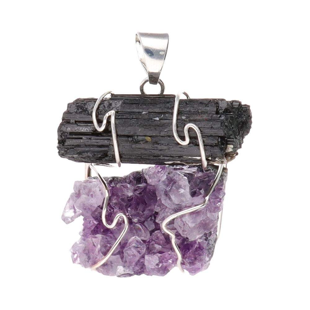 Pendente di tormalina con drusa di ametista in bagno d'argento.