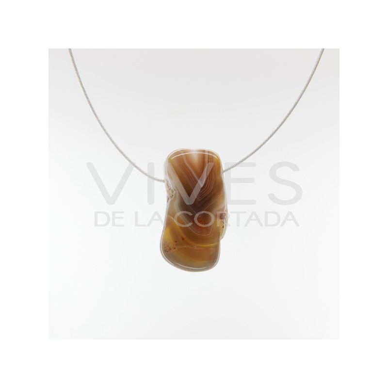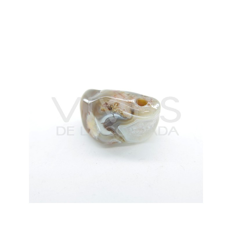 L'Agata è una varietà microcristallina del gruppo del quarzo, un tipo di calcedonia di vari colori che di solito presenta bande cromatiche. Esistono molti tipi di agate, il loro colore dipende dai diversi materiali che possono contenere. Le più abbondanti sono di colore grigio, ma le troviamo anche in giallo, arancione, bianco, blu, marrone e rosa.