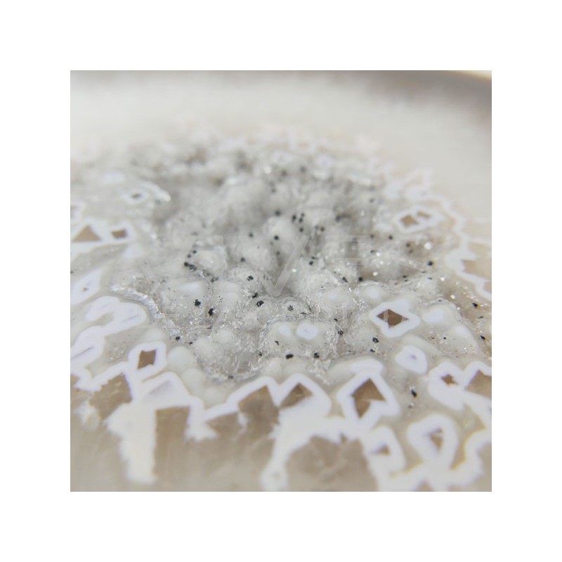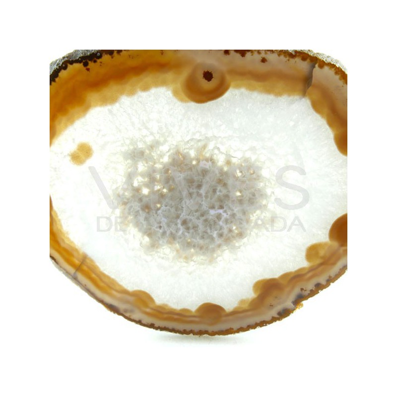 L'Agata è una varietà microcristallina del gruppo del quarzo, un tipo di calcedonia multicolore che di solito presenta bande cromatiche. Esistono molti tipi di agate, il cui colore dipende dai diversi materiali che possono contenere. Le più abbondanti sono di colore grigio, ma si trovano anche in giallo, arancione, bianco, blu, marrone e rosa.