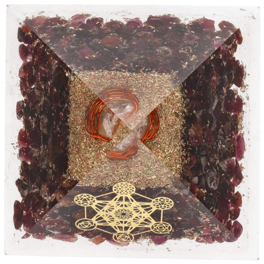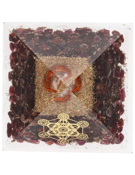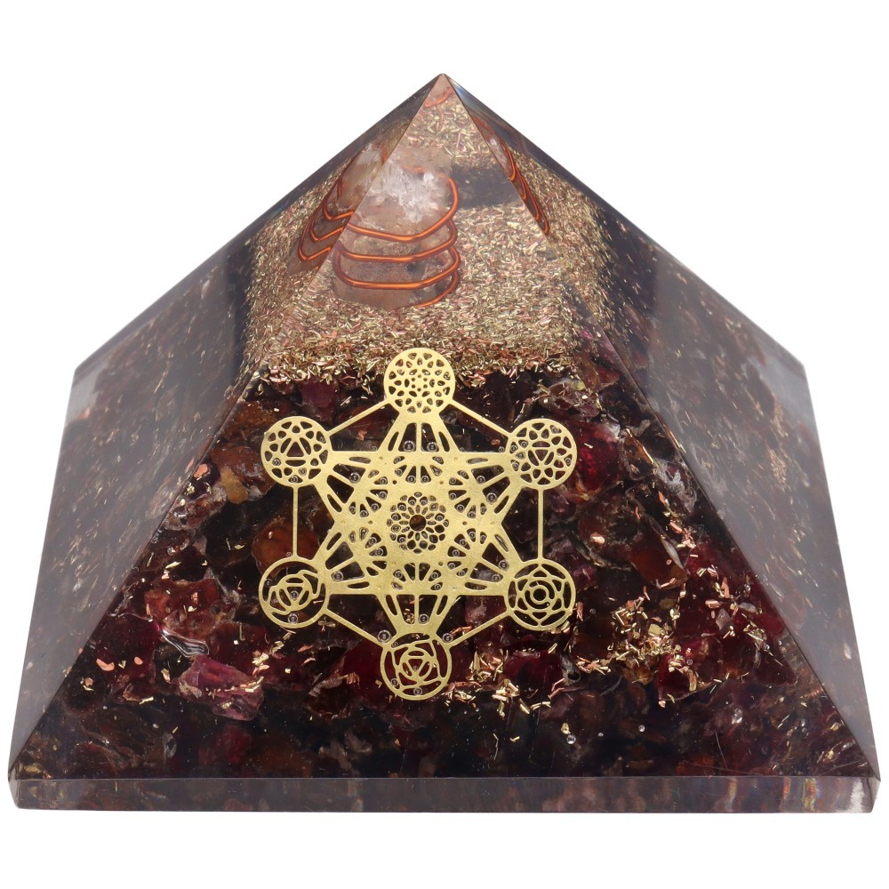 Piramide di granato orgonite in resina con Metatrone 7x7 cm