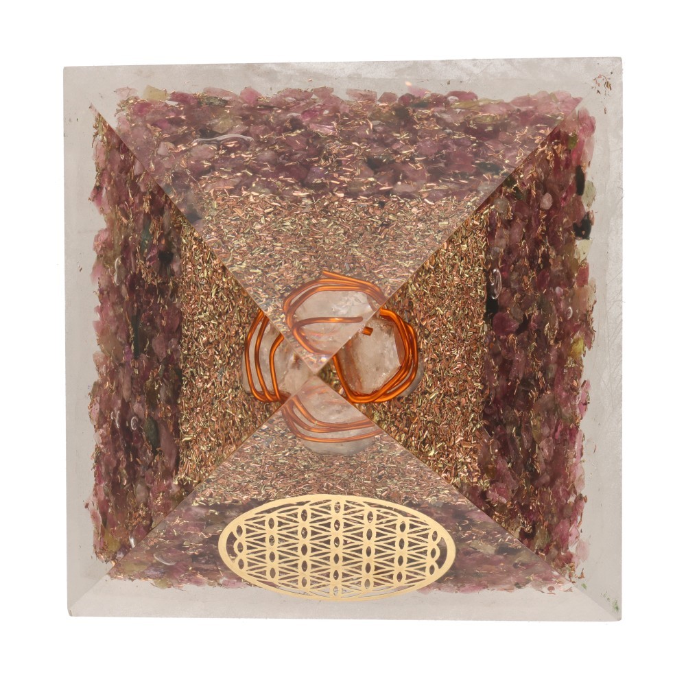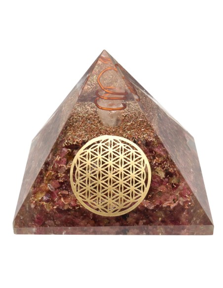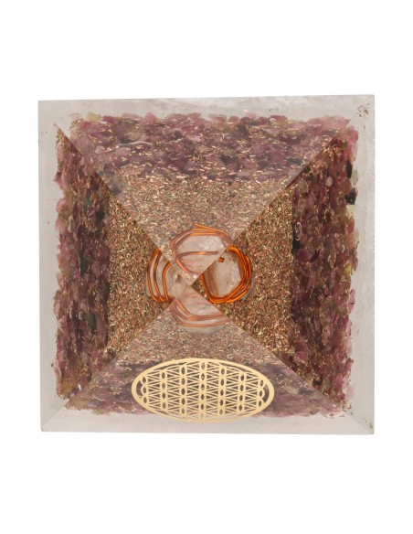 Pirámide Orgonita de Turmalina Rosa en Resina con Flor de Vida 7x7cm