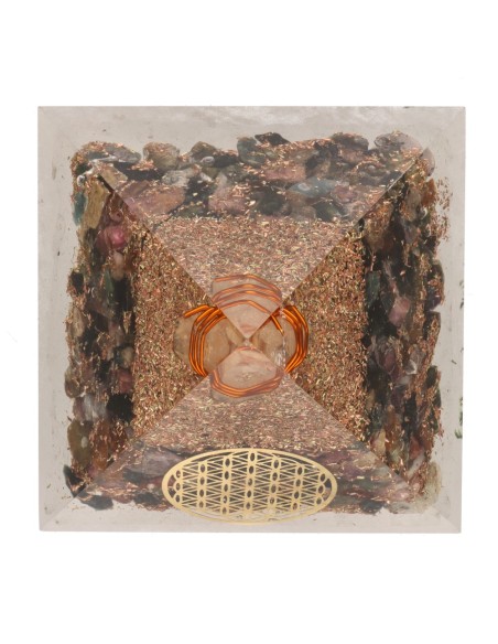 Pirámide Orgonita de Turmalina Bicolor en Resina con Flor de Vida 7x7cm