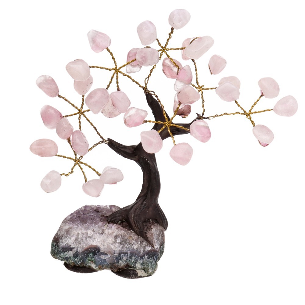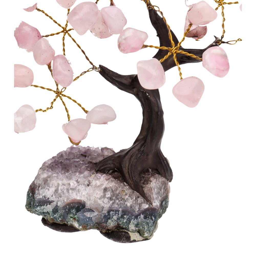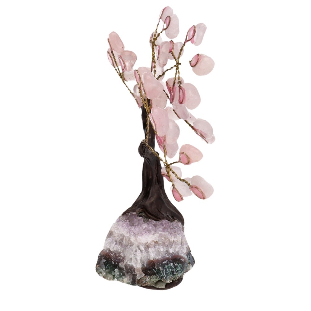 Mini árvore de quartzo rosa com base em drusa de ametista