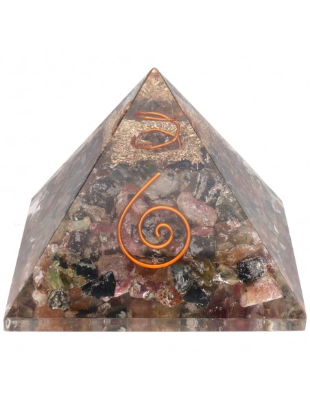 Pirâmide de turmalina multicolorida em resina com espiral 5x5cm